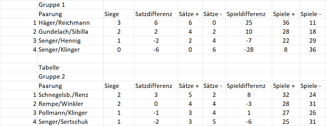 Häger/Reichmann-Gundelach/Sibila (Sieger ist 1ter) 6:1 6:3